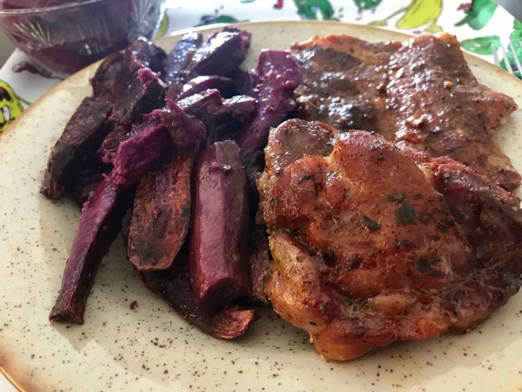 Mindezeken felbuzdulva én is kipróbáltam a batátát. Mivel nem akartam sok időt most a konyhában tölteni, köretként készítettem el a batátát. Hámozás után csíkokra vágtam, tepsibe tettem, olívaolajjal meglocsoltam és a puhára sütöttem fél óra alatt. Nagyon jól passzolt a sült tarja mellé.