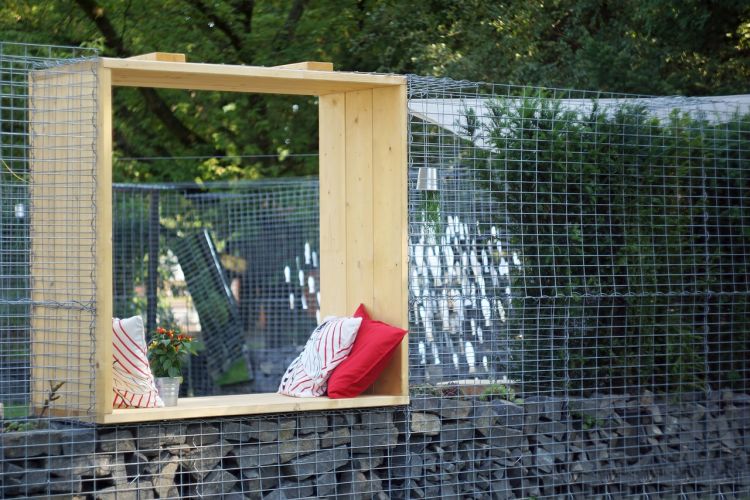 Íme egy modern megoldás. Jó ötlet a kerítésbe beépített pad. Később, ha valaki mégsem a fémháló rajongója, könnyen befuttathatja zöld növényzettel.