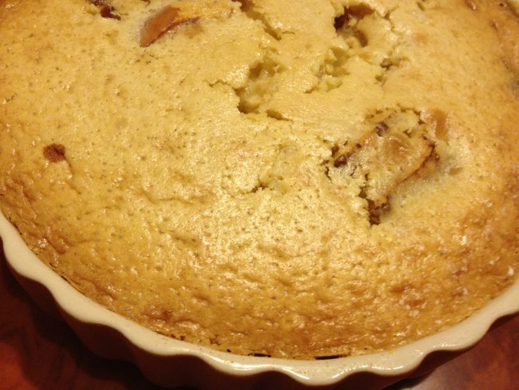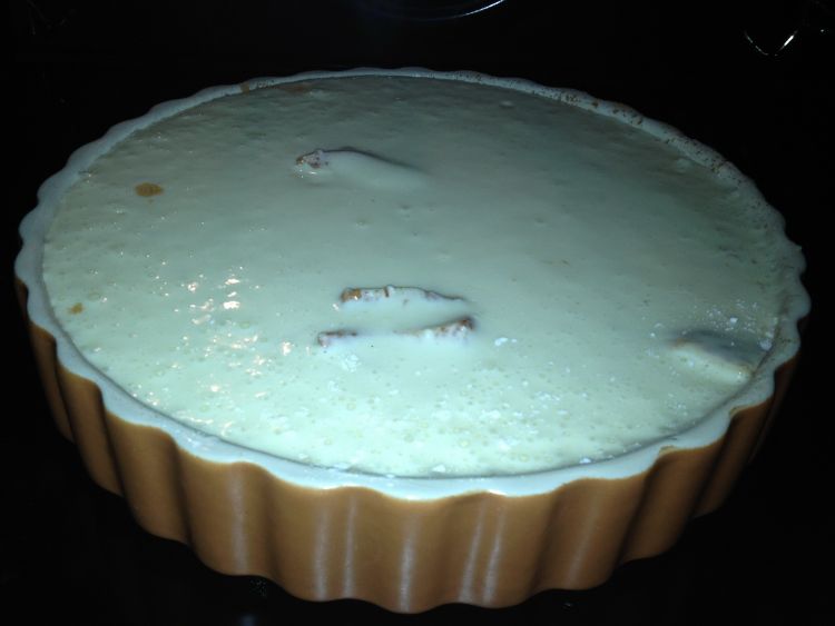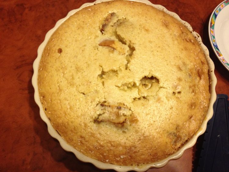 Közben a tojásokat, a sót a cukor felével a robotgépben habosra keverjük. Majd hozzáadjuk a mascarponét és a felolvasztott vajat. Ezt követően a liszttel már összekevert sütőport folyamatosan a masszánkhoz adagoljuk. Majd ezt egyenletesen - az almával kibélelt formánkba - öntjük. Lassan, 160 fokon 30-35 perc alatt készre sütjük.