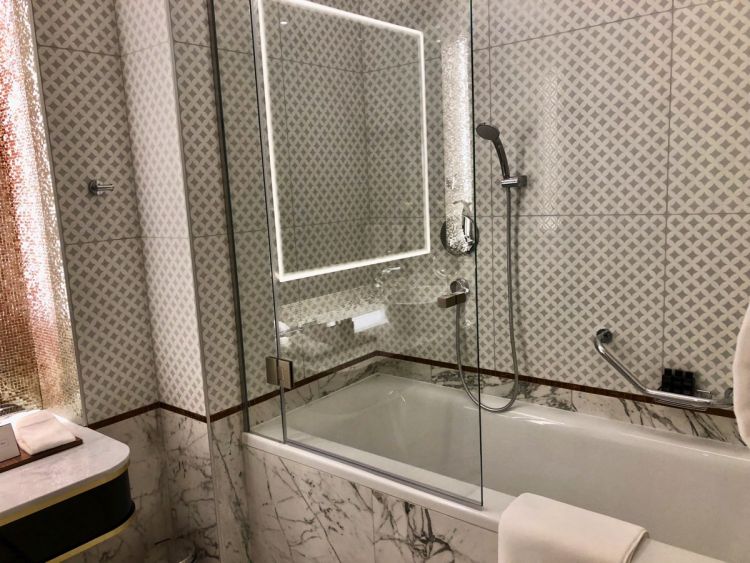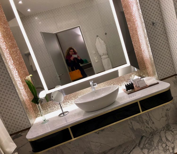 A fürdőszobapult márványból készült, tágas és a visszafogott eleganciát áraszt.