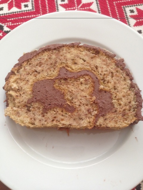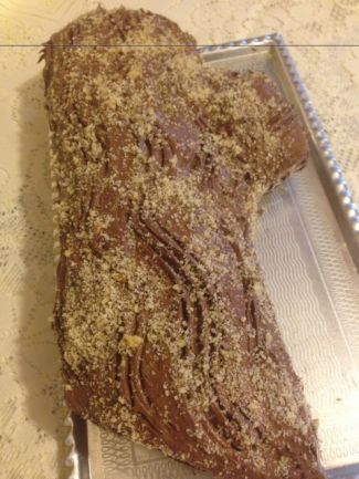Ekkorára a kisült piskóta is kihűlt. Tekerjük ki a ruhából, a belsejébe tegyünk krémet, kenjük szét, majd tekerjük fel. Tegyük a tésztát egy tálcára és a külsejére kenjük rá egyenletesen a maradék krémet. Az egészet cirádázzuk :) meg villával és szórjunk rá darált diót.