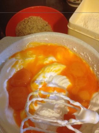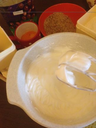 Készítsük 10 tojásból piskótát, amelybe 8 kanál lisztet és 2 kanál darált diót teszünk. Sütőpapírral bélelt gáz tepsibe öntsük és tűpróbáig süssük. Majd vegyük ki a sütőből és egy ruhára borítsuk ki, a papírt szedjük le róla és tekerjük be a ruhával együtt, de nem kell szorosan, csak úgy lazán.