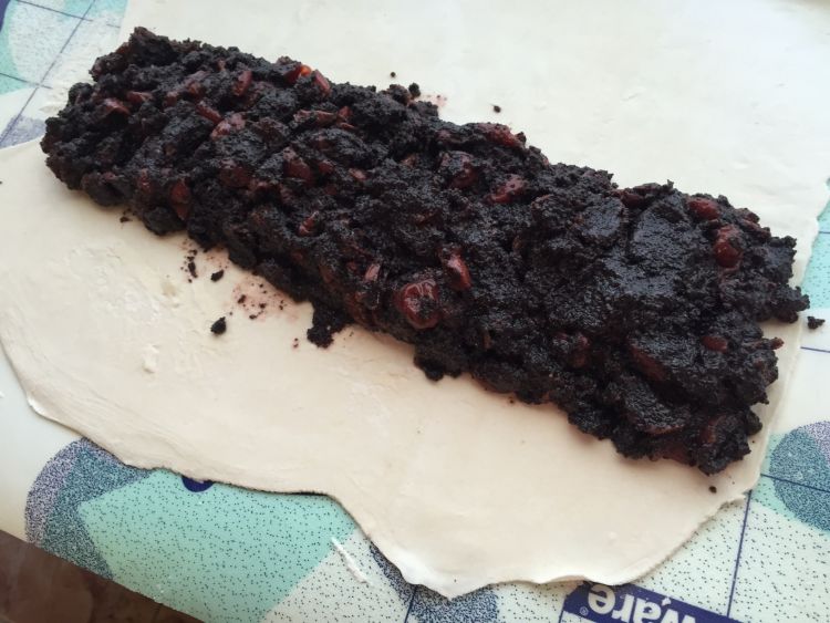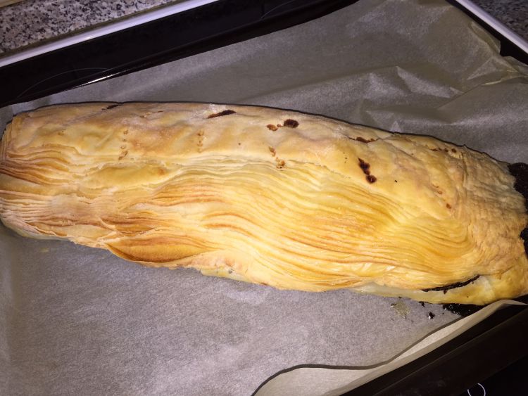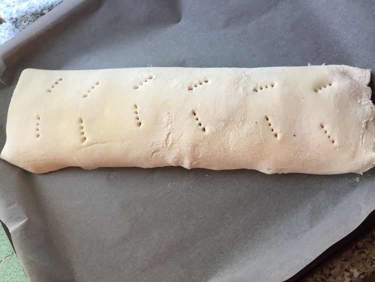 Kinyújtjuk a leveles tészta lapot és a képen látható módon rátesszük a masszánkat. Majd feltekerjük, villával megszurkáljuk és tojás sárgájával megkenjük. A sütőben 180 fokon aranybarnára süssük.