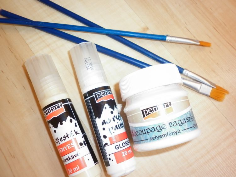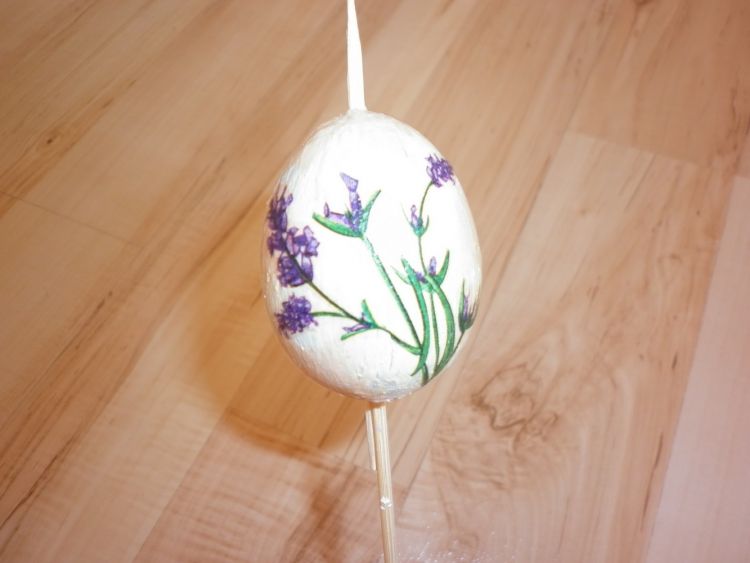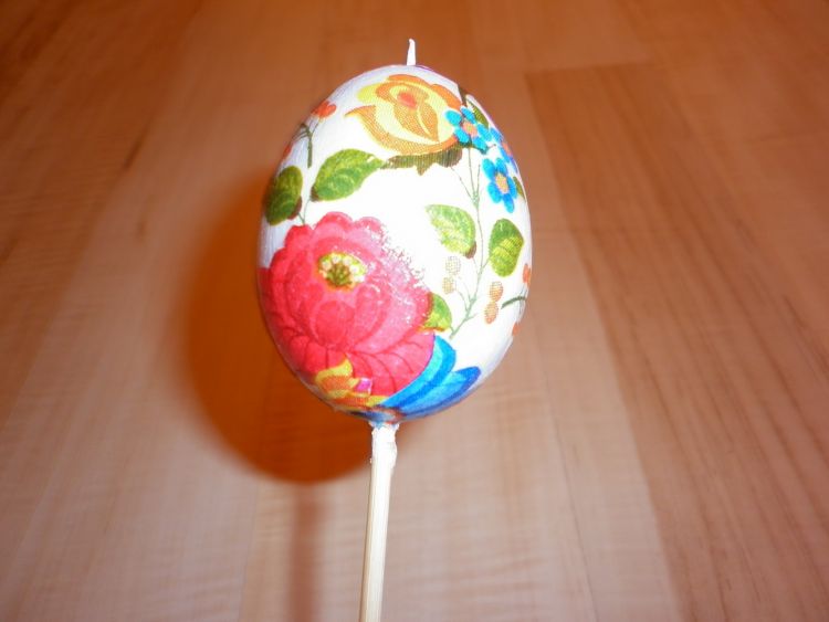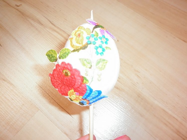4. lépés: Ha kivágtuk a kis virágunkat decoupage ragasztólakk használatával ragasszuk fel a mintát. A tojást kenjük be a kívánt helyen a ragasztónkkal (ne a minta hátoldalát). A ráillesztés után óvatosan húzzuk át az ecsetet a mintán, hogy szépen rásimulhasson.