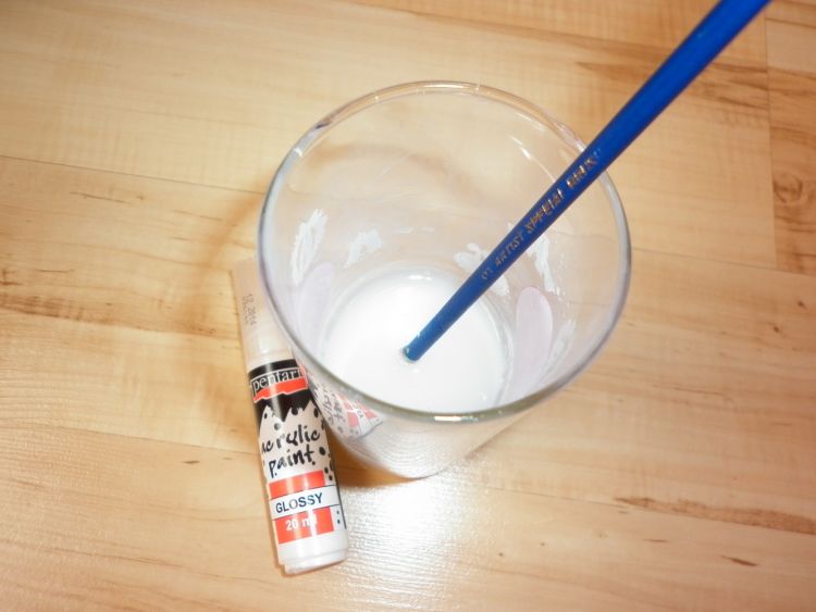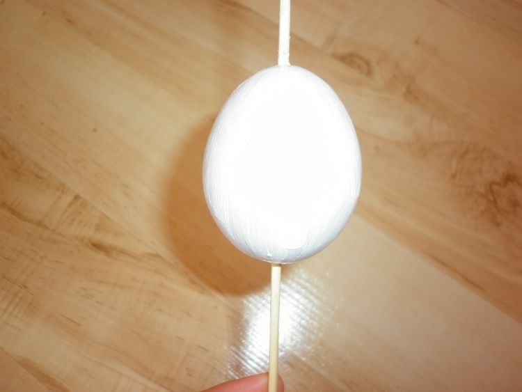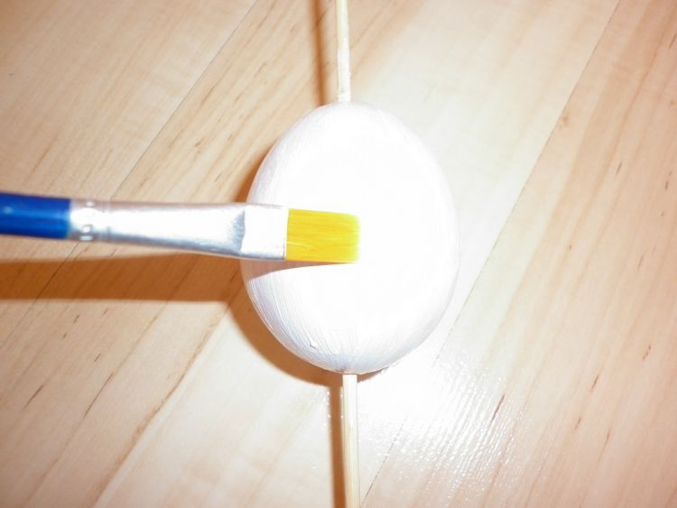 2. lépés: Ha jól kiszáradt, már nem csöpög belőle a víz, akkor egy hurkapálcára vagy saslik pálcára felhelyezzük, mert így könnyebb lesz a festés. Fehér vagy sárga színű akril festékkel (a tojás színétől függően) egy rétegben lealapozzuk. Ha nem fed eléggé, még egyszer alapozzuk le és várjuk meg, hogy megszáradjon. Az ecset legyen szélesebb és laposabb, amit mindig vízbe beáztatva tartsunk. Tipp: legyen mellettünk mindig egy pohár víz és több ecset is.
