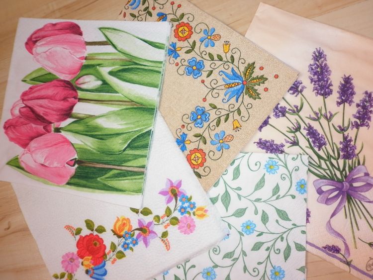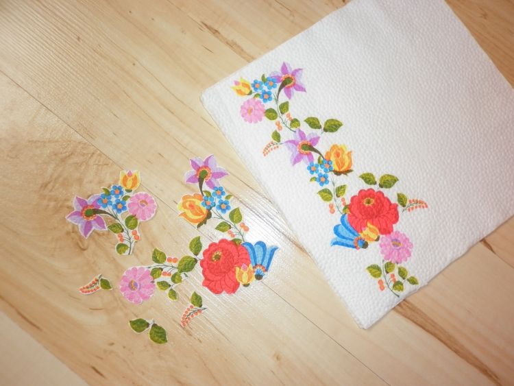 3. lépés: Válasszunk tetszés szerint szalvétát, talán az apró virágminták mutatnak a legjobban. Vágjuk körbe a mintánkat, a szélére hagyjunk rá egy kicsit, nem kell közvetlenül körbevágni a mintát. Háromrétegű szalvéta esetén csak az utolsó réteget távolítsuk el, óvatosan dolgozzunk vele, el ne szakadjon.