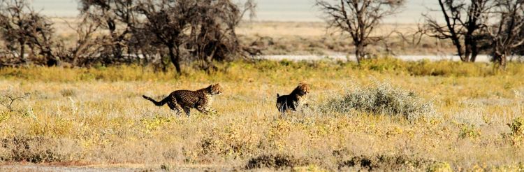 A közeli ivóhelyen viszont két gepárd osztozkodott. Aztán mindketten elindultak az autóink mellett a lenyugvó nap irányába. Mi csak a kecses, nemes mozgásukat figyeltük, amikor a hozzánk közelebb lévő egy nyulat ugrasztott fel. Az események villámgyorsan pörögtek.