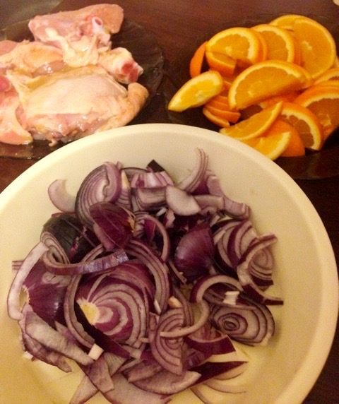 A hagymát meghámozzuk és vékonyra vágjuk, a narancsot is héjastól szeleteljük.