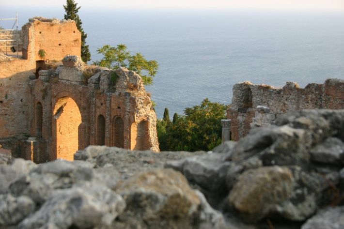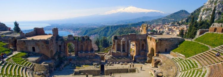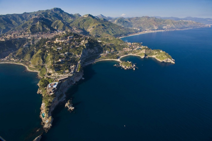 Háttérben Európa egyik leghíresebb, ma is működő vulkánjával, a hófödte Etnával, a partvidékre meredeken leszakadó hegyes-völgyes tájjal, a citrom- és narancsligetekkel, és a messze távolba elnyújtózó, csillogóan kék Ión-tengerrel ez Európa egyik legszebb panorámájú vidéke.