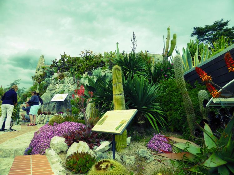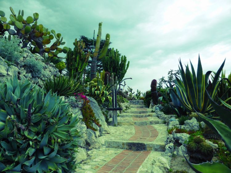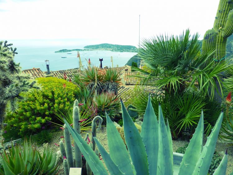Innen, a kaktuszok tövéből fényképezve elénk tárul a különleges mikroklímájáról, Rotschildek kertjeiről is nevezetes Cap Ferrat-félsziget és maga az azúrkék tenger.